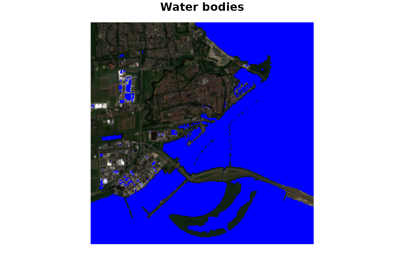 plot(waterbodies, rgb = 1:3, main = "Water bodies")